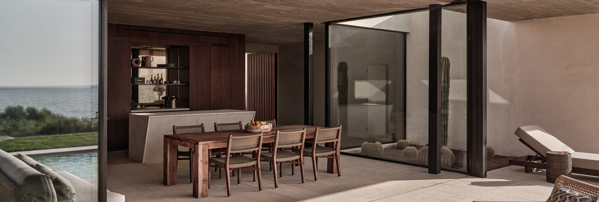 Bar und Restaurant zugleich, hier startet der Tag beim Frühstück und endet oft mit langen Nachmittagen unter der Pergola mit Sunset-Blick.