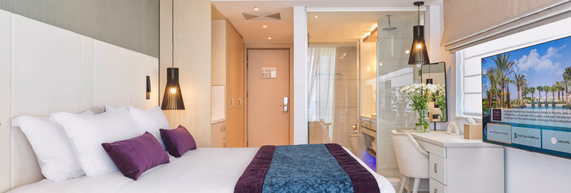 Die 140 hochmodern und stilvoll eingerichteten Zimmer verfügen allesamt über raumhohe Glasfenster, durch die Sie jederzeit eine traumhafte Aussicht über das wunderschöne Ayia Napa genießen können. Diese wird abgerundet vom Zugang zum privaten Garten oder Pool.