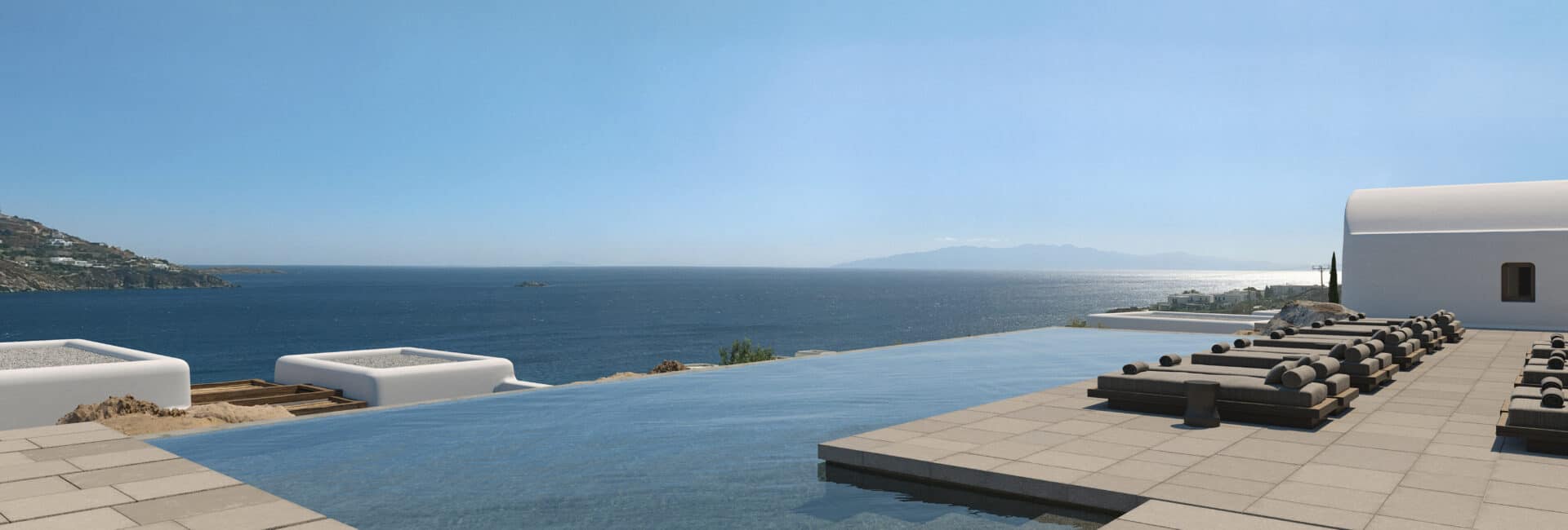 Alle Suiten mit Meerblick sind mit natürlichen Materialien, luxuriösen Möbeln und neutralen Farben ausgestattet und strahlen Eleganz aus. Sie haben eine eigene Terrasse von 90 m² mit Blick auf die Ägäis, einen beheizbaren Swimmingpool und einen schattigen Essbereich.