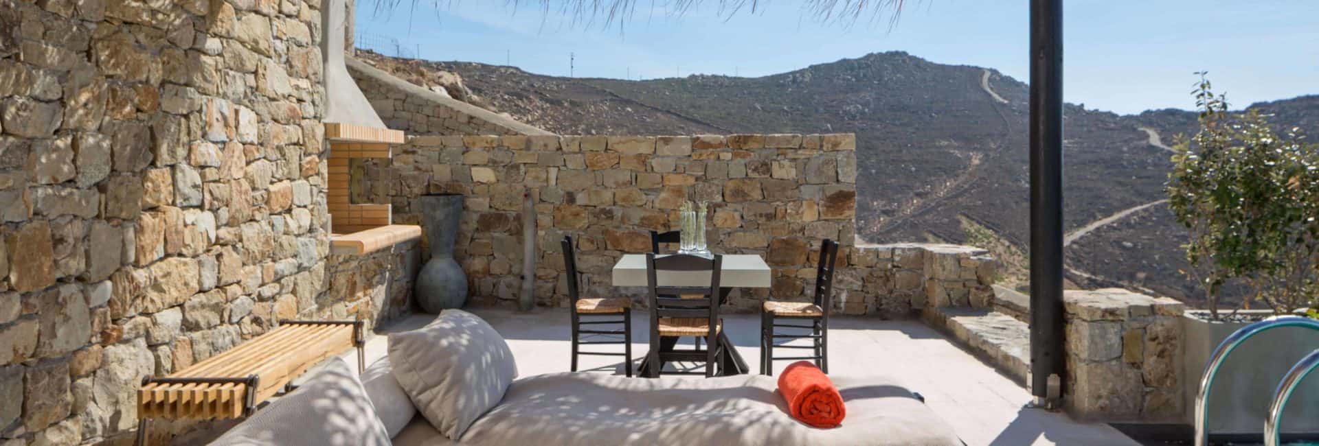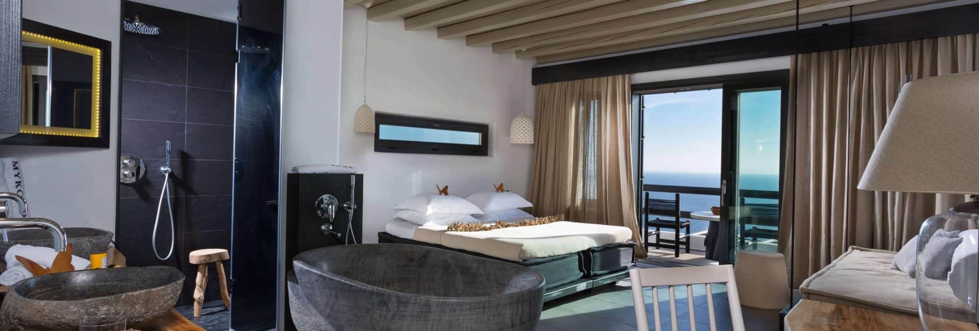 Utopia – ein imaginärer Ort, an dem alles perfekt ist. Im Myconian Utopia Resort wird dieser Traum real. Edle Naturmaterialen, wie Stein und handgefertigtes Holzelemente, treffen auf ein modernes, ausgeklügeltes Design und eine spektakuläre Sicht auf die Bucht von Elia Beach sorgt für den perfekten Lifestyle-Urlaub. Im Pavillon Restaurant genießen Gäste modern interpretierte mediterrane Küche auf Relais & Châteaux-Niveau oder entspannen in einem der führenden Thalassotherapie-Spas der Insel. Ein weiteres Highlight ist der Infinity-Meerwasser-Swimmingpool. Hier lädt die Pool-Bar bei DJ-Klängen zu leichten Snacks und Erfrischungen ein. Mit dem Schwerpunkt auf natürlichen Materialien werden alle Möbel in der Region hergestellt und umfassen schöne Liegestühle und Stühle, die allesamt einzigartig sind. Die Zimmer sind weiß getüncht, haben offene Korridore und Treppen, die sich durch den Hügel schlängeln, so dass der Grundriss an die kleinen Straßen von Mykonos erinnert. Es ist hell, luftig und fast alle Gemeinschaftsräume sind Indoor / Outdoor. Der Infinity-Pool und der hängende ‚Strand‘ – eine überdachte Sandterrasse mit runden Liegen, Treibholz und Blick durch Glaswände – tragen zum natürlichen Ambiente bei.