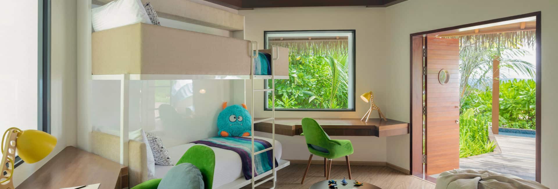 Die Family Villa verfügt über die identische Ausstattung wie die Beach Villa. Darüber hinaus bietet sie ein Kinderzimmer mit Etagenbett und Spielecke.