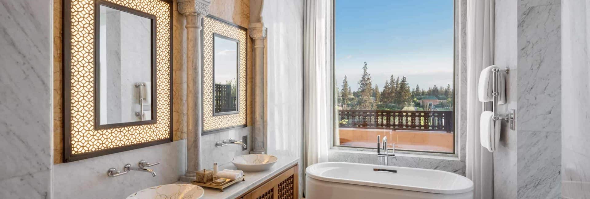 Die Deluxe Zimmer mit privater Terrasse bieten einen ungehinderten Blick auf die Gipfel des Atlasgebirges. Ausgestattet sind sie wahlweise mit einem Kingsize-Bett oder zwei Twin-Betten, einer großen Terrasse und einem großzügigen Badezimmer mit Badewanne und separater Dusche.