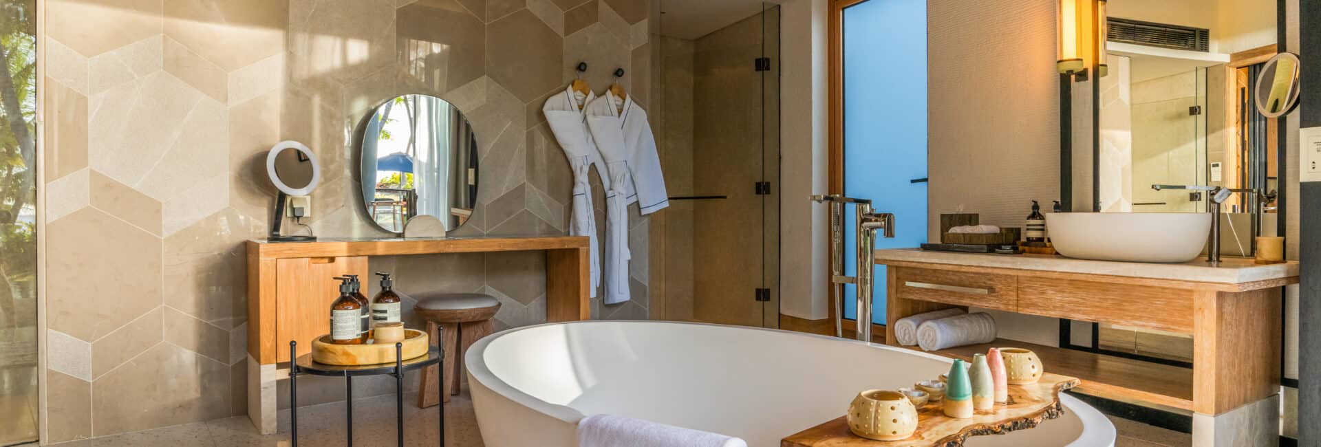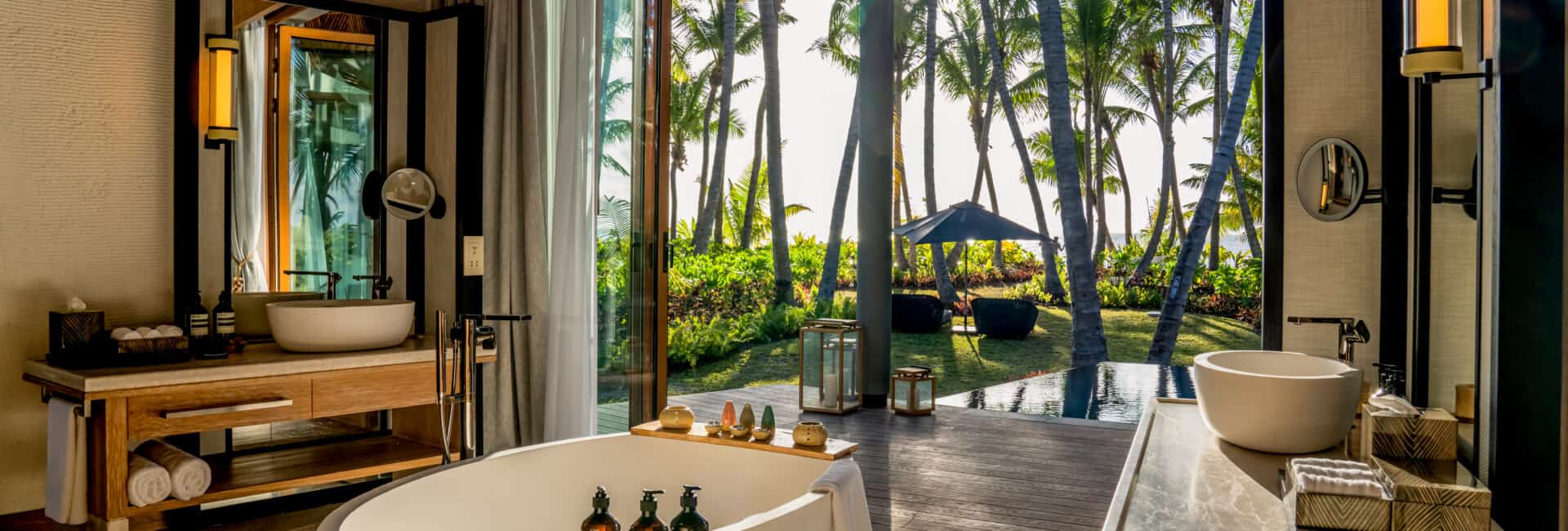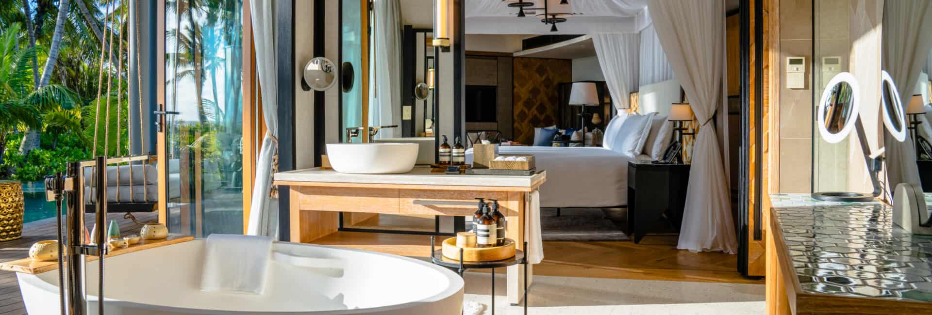 Seine moderne Architektur harmoniert perfekt mit der üppigen Natur der Insel und schafft so die Grundlage für ein Maximum an Privatsphäre, da hier jeder Gast eine der 57 Poolvillen erwartet, die in harmonischen Farben, hochmodern und natürlich gestaltet sind.